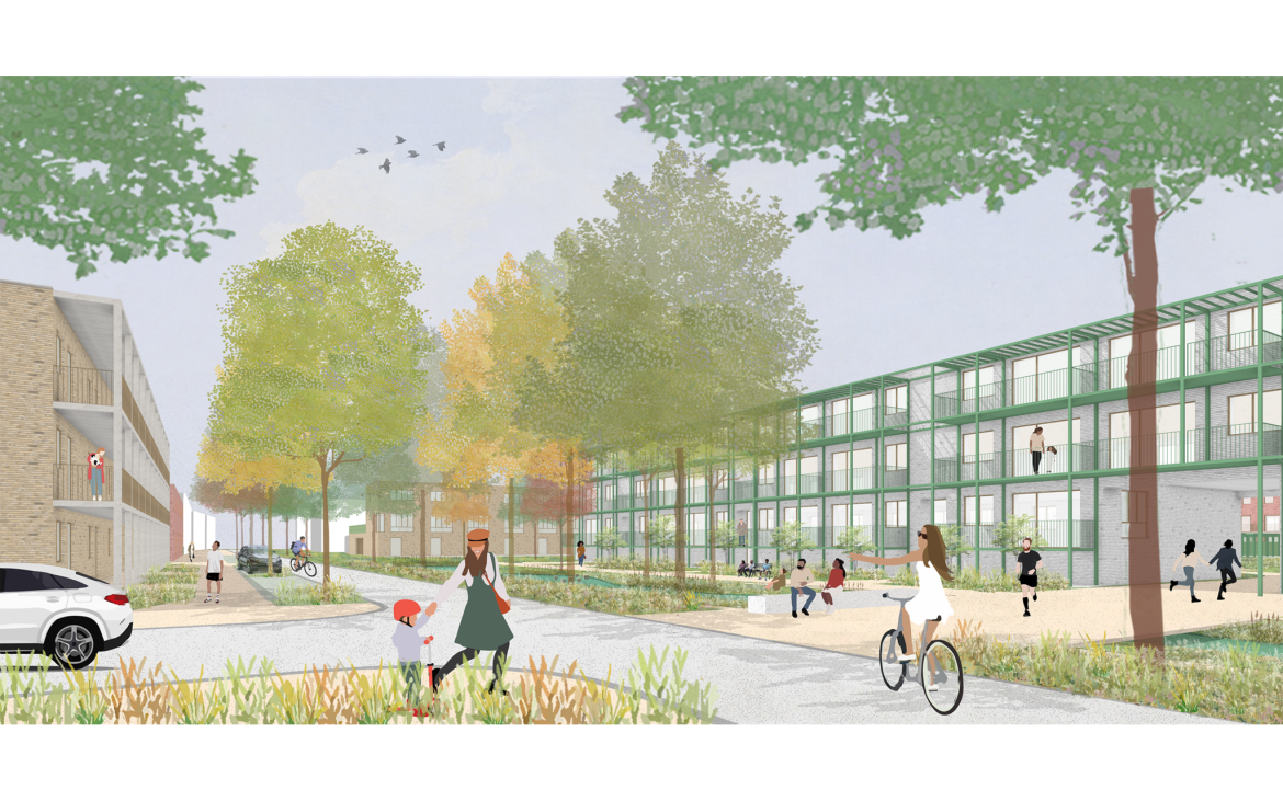 Kasteelplein is a quiet neighborhood that is continuously evolving. Its current form is the result of a phased process of additions, demolitions, and renovations that began in the early 1920s. The 2019 masterplan marks a new chapter in this transformation. A radical and ambitious vision aims to drastically reshape what the designers describe as a “banal neighborhood.” This vision is built on a dual and complementary strategy: green fingers and residential courtyards. The green fingers permeate Kasteelplein, strengthening the connection to the municipal park and the town center. The residential courtyards foster a sense of community among the homes.