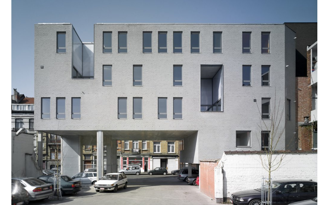 A delivery zone and an existing parking of Colruyt on the groundfloor define the internal circulation of the building and the organisation of the apartments. To create a continuity in the urbanistic context, elevations, volumetrie and materials are similar with the future corner building. All the apartments have deep and double-high terraces. This promotes the privacy in the busy street and provides the deep exterior rooms with more light. The volumes on the upper floor are delimited with polycarbonate-panels that let light through without having a view on and by the neighbors.