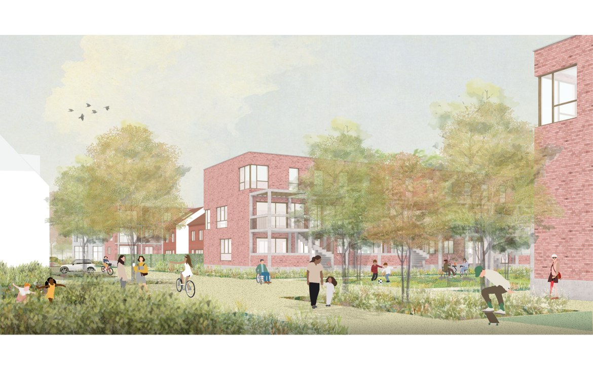 Kasteelplein is a quiet neighborhood that is continuously evolving. Its current form is the result of a phased process of additions, demolitions, and renovations that began in the early 1920s. The 2019 masterplan marks a new chapter in this transformation. A radical and ambitious vision aims to drastically reshape what the designers describe as a “banal neighborhood.” This vision is built on a dual and complementary strategy: green fingers and residential courtyards. The green fingers permeate Kasteelplein, strengthening the connection to the municipal park and the town center. The residential courtyards foster a sense of community among the homes.